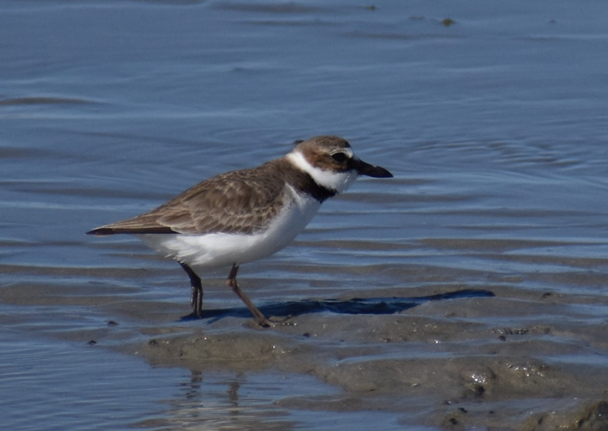 In the breeding season the plumage of the back is brown, light brown head, white forehead with a black band on it, the throat and abdomen are greyish divided with a thin brown line. The bill is black and thick, the tail is small rounded with white outer feathers and long, greyish-pink legs.